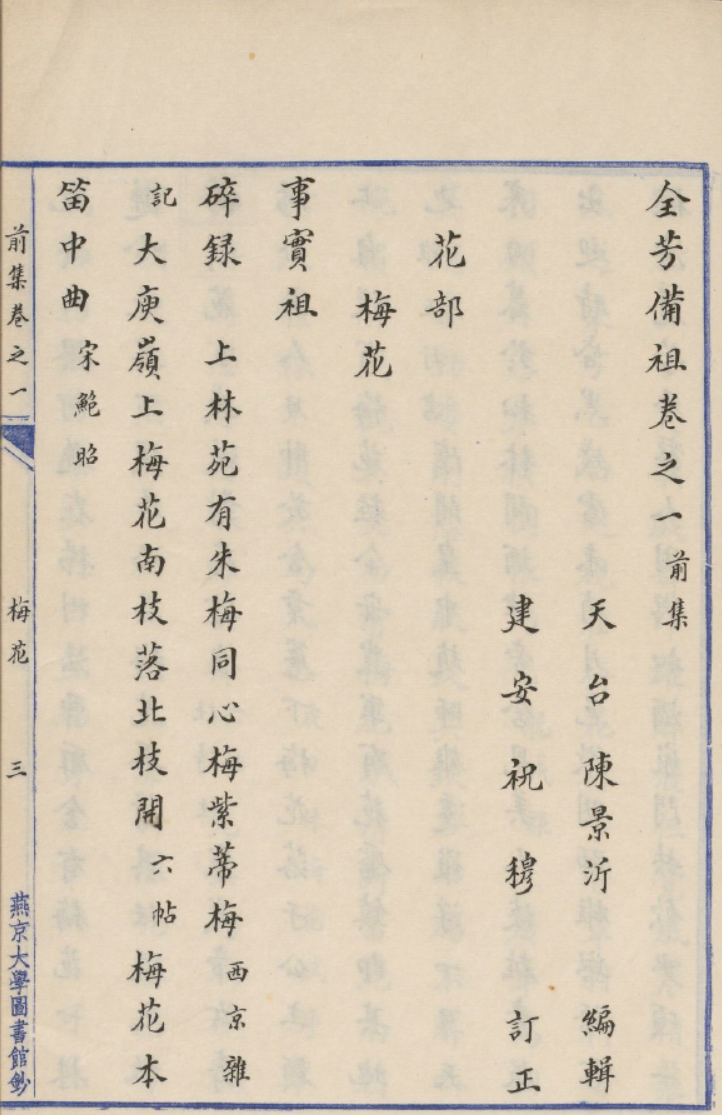 《全芳备祖》,南宋陈景沂所辑,祝穆订正,前集二十七卷,后集三十一卷,共五十八卷,乃一部集大成之园艺类书也。此书收录花卉、果木、蔬菜、药材等植物,详述其形态、习性、栽培之法,并附以诗词歌赋,可谓包罗万象,博采众长。民国年间,燕京大学图书馆以精钞本传世,堪称古籍之瑰宝。