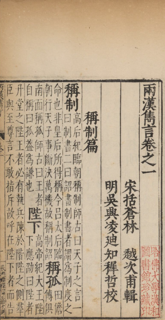 《两汉隽言》十六卷,明凌迪知校,宋林越辑。是书为明万历四年凌氏桂芝馆刊本,乃辑录两汉典籍中之隽永名言,集其精华,以为学者之资。