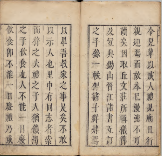 今有清同治七年江苏书局刻本,乃据宋本重刊,字体清晰,版式古朴,字迹端严,纸墨俱佳,诚为善本。其书内容,自冠、婚、丧、祭四礼始,述礼之仪文、仪节,乃至器物、服饰、音乐、饮食诸细节,无不备载。体例严谨,考据详实,凡古礼之精义,皆一一阐明,诚为研习礼仪者不可不读之书。